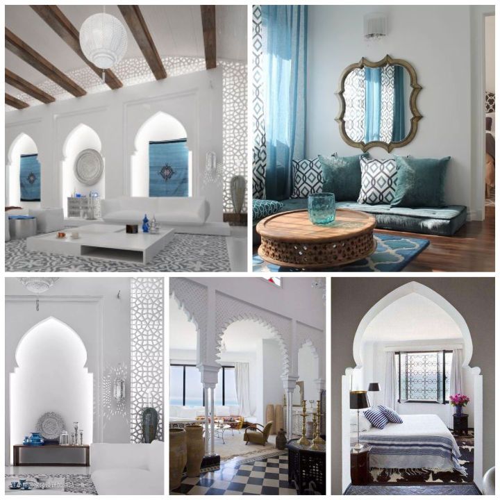 伊斯兰风格的特征是东、西方合壁,室内色彩跳跃、对比、华丽,其表面装饰突出粉画,彩色玻璃面砖镶嵌,门窗用雕花、透雕的板材作栏板,还常用石膏浮雕作装饰。砖工艺的石钟乳体是伊斯兰风格最具特色的手法。彩色玻璃马赛克镶嵌,可用于玄关或家中的隔断上。
