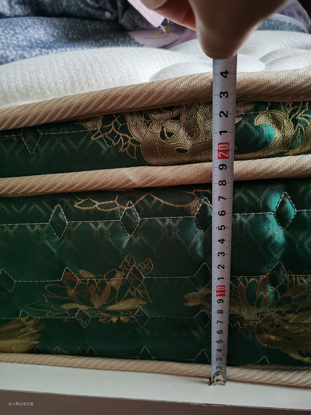 垫子的厚度要比我家所有的垫子都厚,这样在起床的时候,腰部就会省劲一些。我收货之前去淘宝看了这款垫子,淘宝里介绍这款垫子是由柔软的针织布料、清晨纤维、舒适海绵、优质乳胶、高效能海绵、3D山棕层、平衡舒压层、宝奈尔弹簧系统、热烘棉边框、平衡舒压层、舒适海绵、精巧的针织布料而组成,这么多层肯定会比其它的厚实啦!我特意量了一下垫子的厚度为24厘米,比我家最后的垫子厚了整整6厘米。