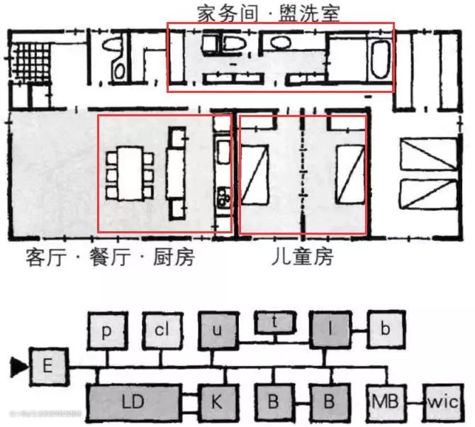 在上图中,三个独立的区域从局部联动发展成为了整体的联动。而在实现这样的结果之前,首先每个区域的功能需要集中,就像盥洗室与家务室最好在设计时便能形成一个整体,方便使用。我们可以用日本的一个案例来说明。