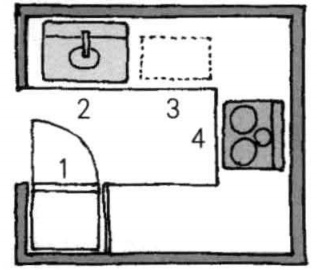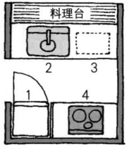 △1.冰箱—>2.水槽—>3.砧板—>4.燃气灶