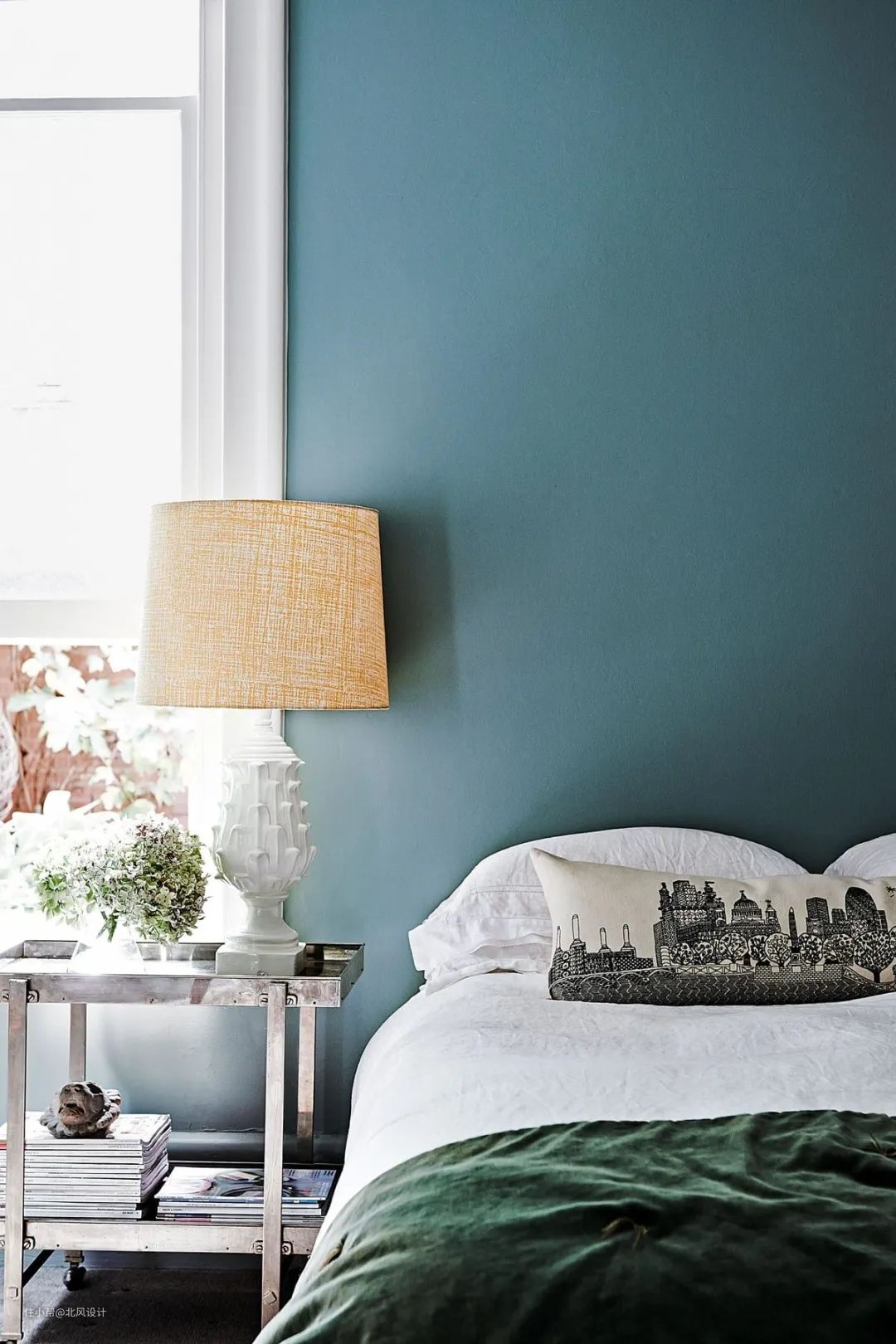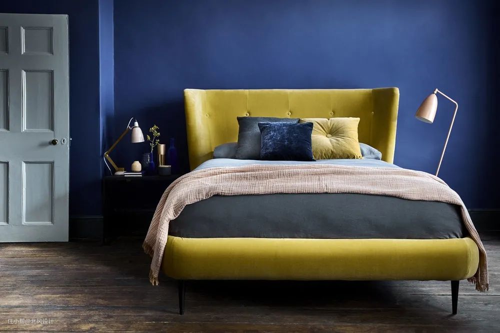 这种深蓝色的墙壁创造了一个现代和戏剧性的卧室背景,富于动感。简洁的纹理突出了色彩的作用,就像印象画中的表达。