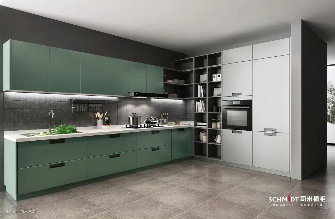 在色彩上用充满生机又温暖的莫兰迪绿营造活力,用带有灰度的色系打造宁静柔和,低饱和度的色调富有治愈气息,增加厨房的轻奢气息。