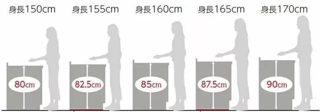 一般台面高度建议80-90cm左右,或者直接记下这条黄金公式:使用者身高/2+(5-10)cm。这样就不会出现洗菜腰累、炒菜手肘累的情况。