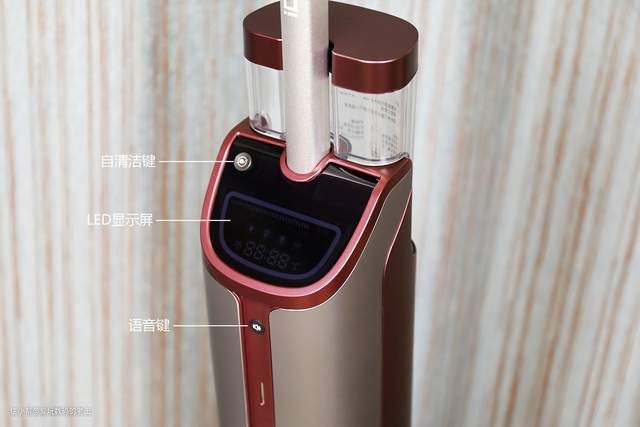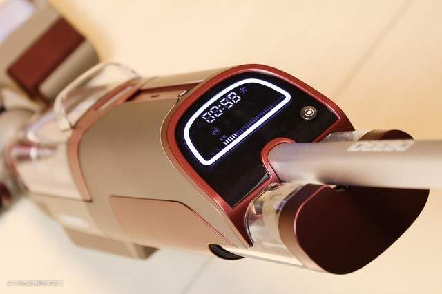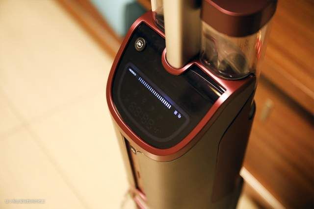在机身顶部设计了一个向下倾斜的LED显示屏,当我们在清洁卫生时低头就能看到屏幕显示的信息,比如:显示电量、使用时间、档位、水量提醒、清洁提醒等。在显示屏的左上角有一枚自清洁按键,当机器充电时可一键自动清洁滚刷、管道、污水箱等部件,这个功能非常实用,在后面体验部分我还会详细介绍。