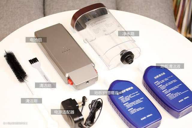 除了机身组件,艾迪宝洗地机T80的配件包括:电池、水箱、清洁刷、电源适配器、充电底座、附件架、地板清洁液、地板护理精油。艾迪宝洗地机T80没有多余的清洁套头,看来它主打地板清洁。