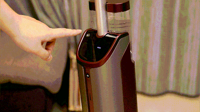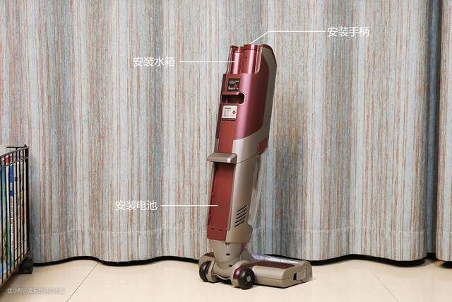 平时常用的手持无线吸尘器的电机、垃圾存储等部件大都集中在手持部分,而艾迪宝洗地机T80的重要组件都集成在下半部分,造型很像一条机器人的腿,金属质感很强,暗红色和暗灰色的搭配透漏着一丝丝工业气息。