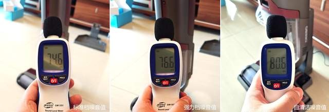 艾迪宝洗地机T80机身遵循一体化设计,再加上独特的风道设计,让它有着不错的噪音控制。在正常使用中,我分别监测了两个档位和自清洗时的噪音,标准档74.6dB、强力档76.6dB、自清洁80.6dB。没开机之前我以为艾迪宝洗地机T80这体型应该会有很大噪音,使用之后发现它的噪音和手持无线吸尘器差不多。