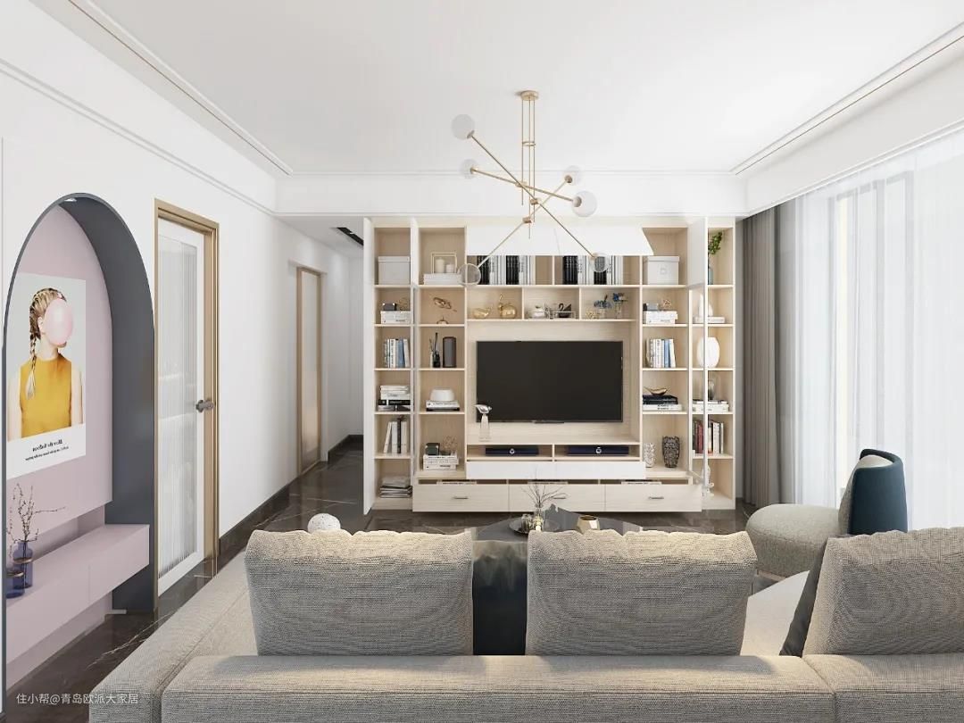 这种设计相对来说更侧重于展示,所以适合客厅空间较大的家庭。如果户型不够宽阔明朗,又想打造满墙电视柜,那么小欧建议柜体尽量选择白色、杏色、木色等浅色系,因为浅色有放大空间的效果,又能减少空间的压抑感。