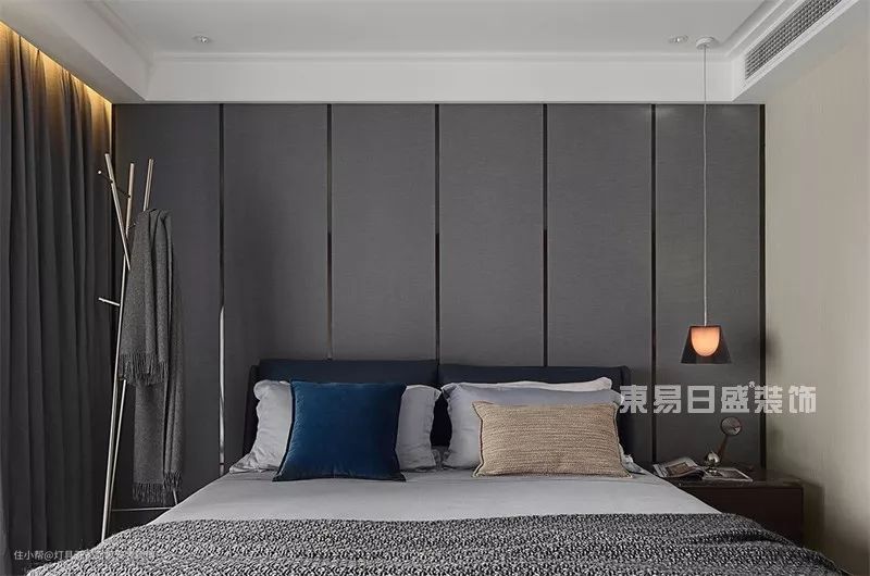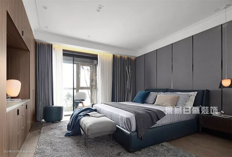 主卧剔除琐碎,在基本元素的抽象演绎下,延续暮光蓝的点缀。丰沛的自然光线,细腻亲肤的床品,营造出温馨舒适的休憩空间,让人卸下疲惫,尘嚣烦扰俱消。