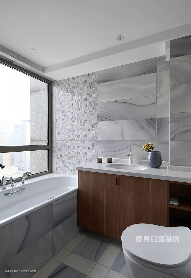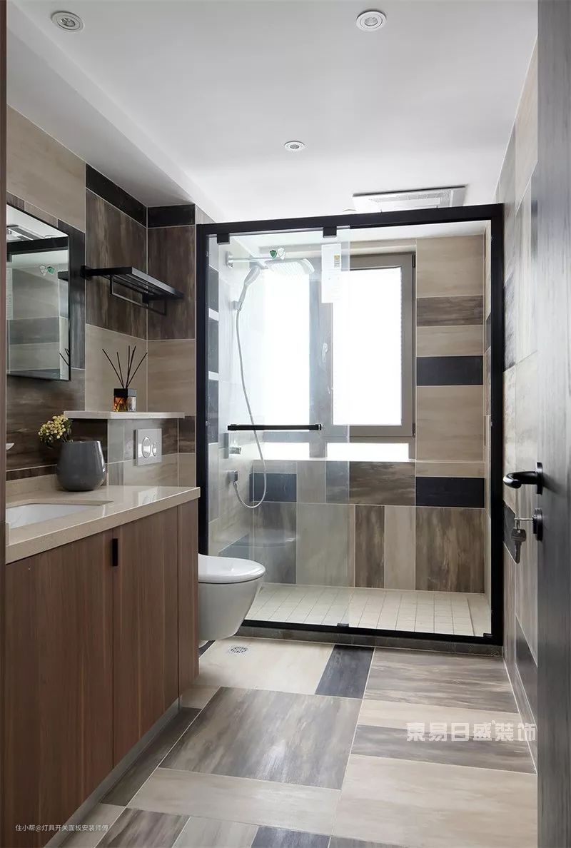 主卫空间中,深胡桃色介入黑白灰色调,不同肌理在设计中调和统一,简约而不失细节。客卫大胆选择犀牛角颜色拼花瓷砖,满足对艺术的追求,嬉皮风范。