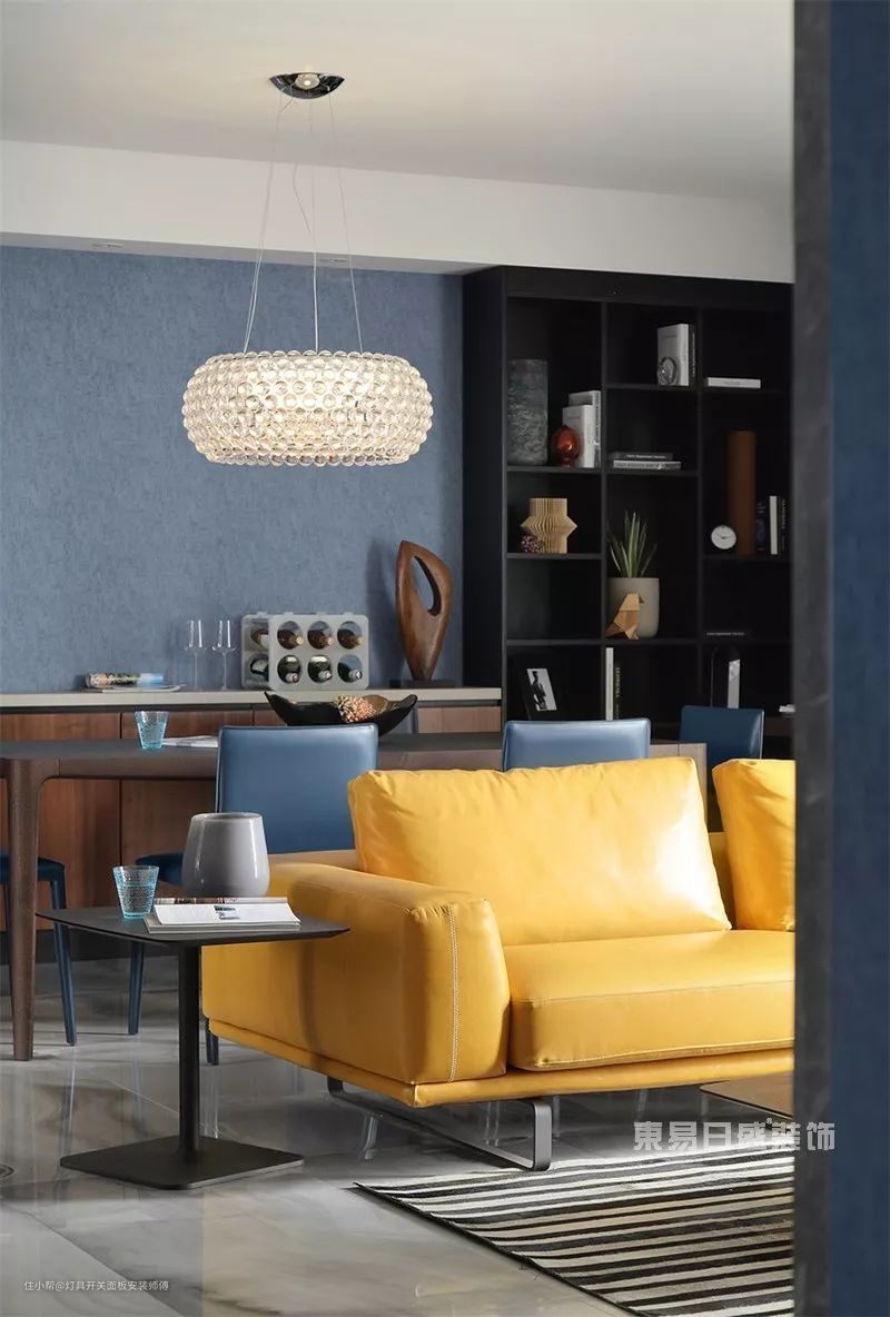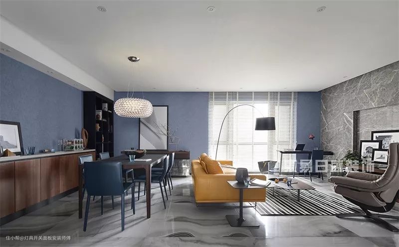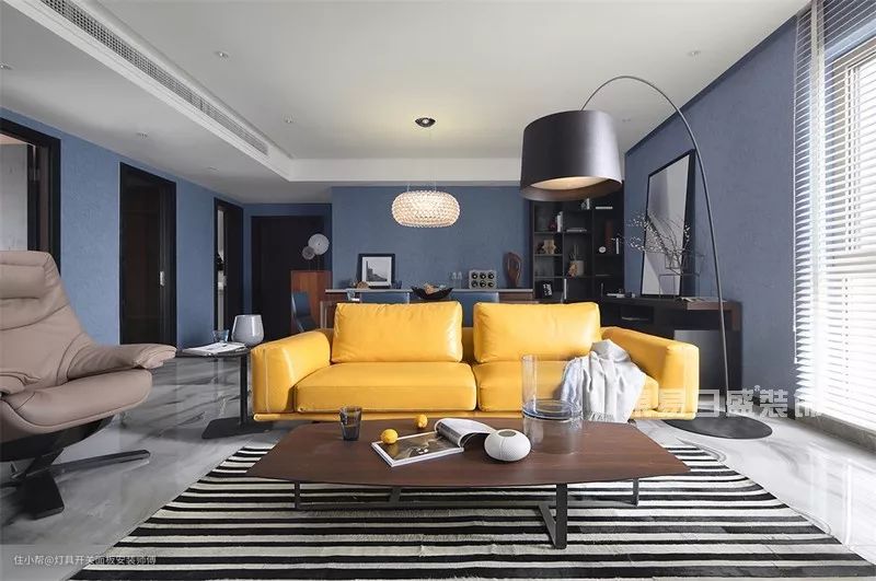入户第一印象的客厅,空间在色彩的应用上,富有艺术穿透力,处处可见自由的灵魂。暮光蓝与樱草黄沙发的搭配,冷色调与暖色调的碰撞,述说着简练的造型语言,凝聚生活中每一段欢乐时光的瞬时光泽。