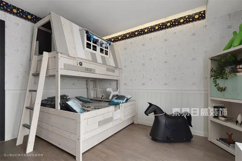 儿童的瞭望塔床趣味横生,可作睡床亦可在里面玩耍,给了孩子实现梦想的渴望!形状各异小动物装饰品的介入使得儿童房充满童趣、动感与跳跃,一个孩童的小天地由此成型。