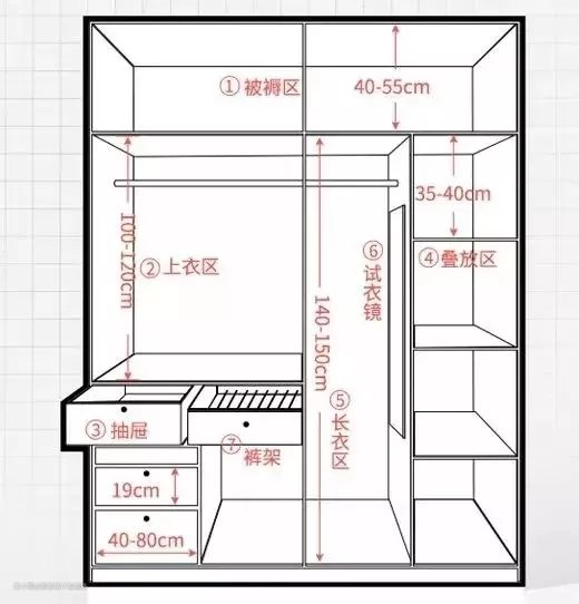 ②叠放区:隔板高度在40-60cm之间即可,宽度可根据衣服的宽度来决定,一般在30-40cm之间。