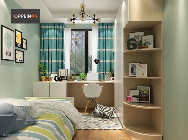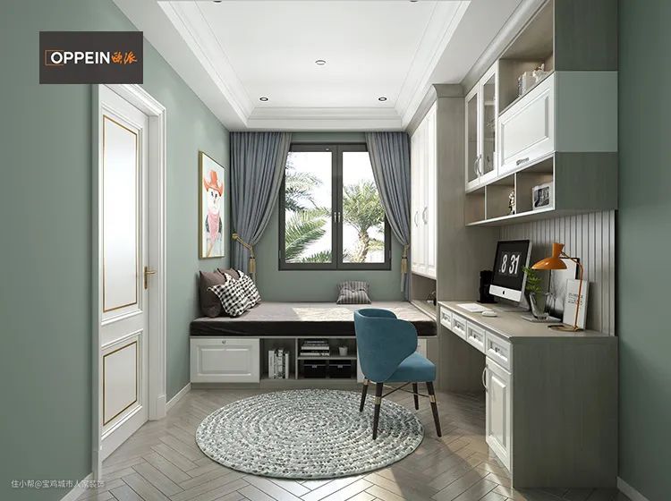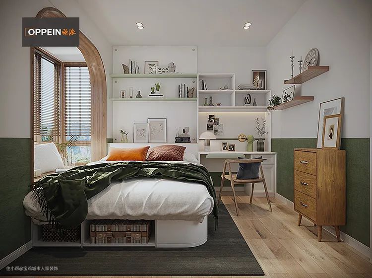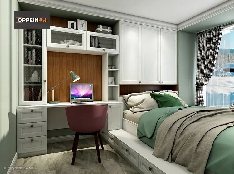 床底带抽屉,底层床上方带开放柜。窗户边定制书柜、书台,书台旁定制平开门衣柜。