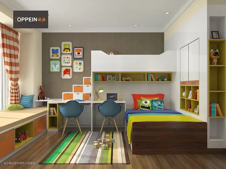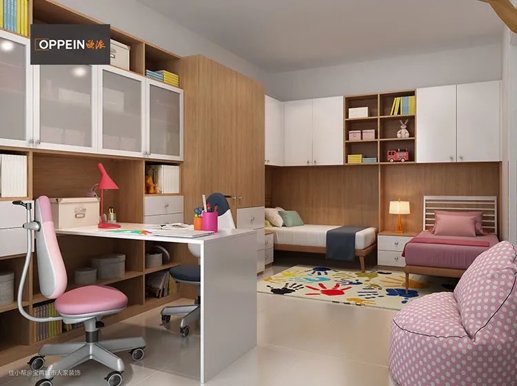 两个娃不仅要满足睡眠,还要满足学习和收纳。设计师这样分配空间,确实值得参考。