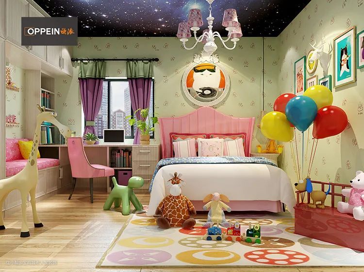 星空灿烂的吊顶,粉色软装,一体化定制的衣柜、收纳柜和书台,还辟出阅读角。