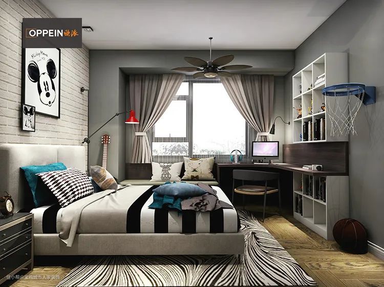 如果学习与收纳不容易同时满足,建议把床放二层,这样各种生活需求都满足,还多出不少走动空间。