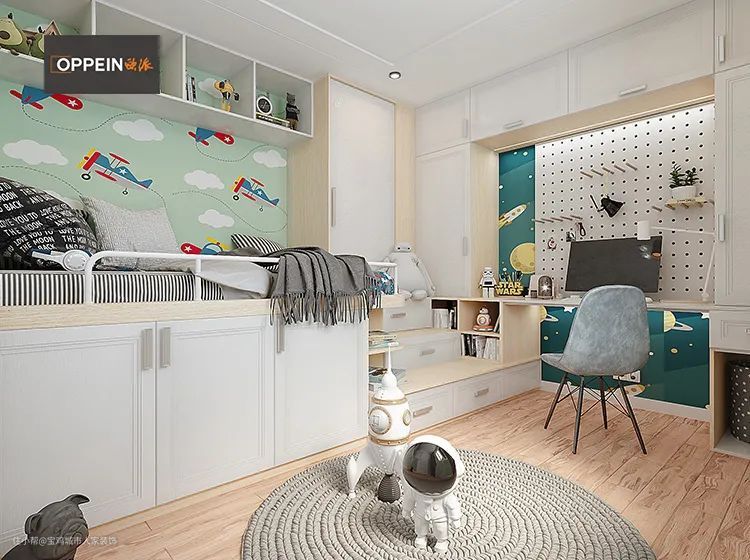 榻榻米儿童房有不少地方不应该浪费,比如床底下做抽屉,边柜做开放柜等等。