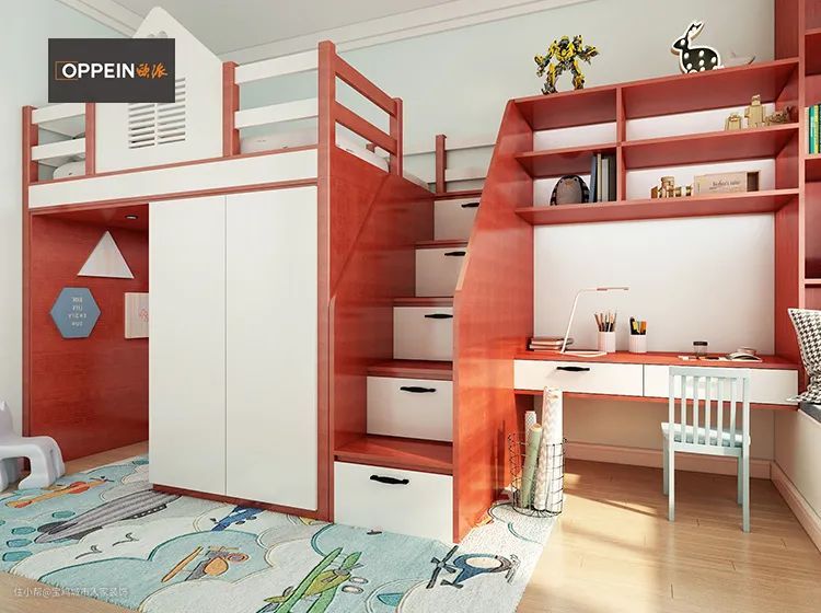 如果想要锻炼小朋友收纳能力的,这款设计不错。床升高,下部做五门柜体,带柜门的,不带柜门的都有。地面与床之间设计阶梯,阶梯为抽屉,也可以收纳。自己的衣服、玩具自己收。