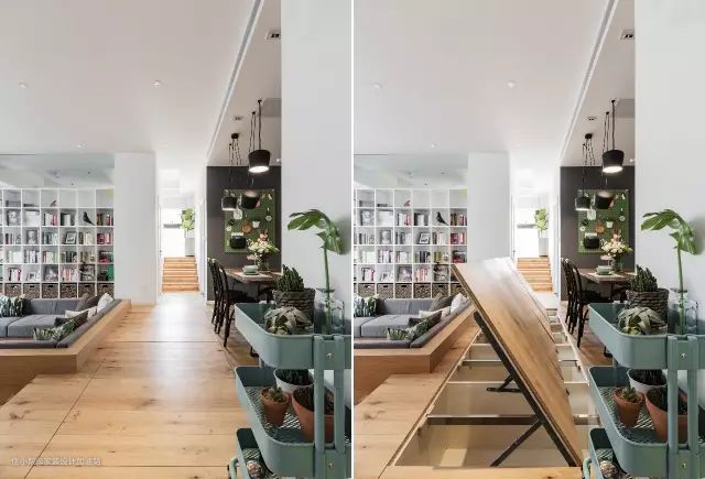 地面局部抬高50公分达到增强储物空间的同时自然形成了下沉客厅的雏形。