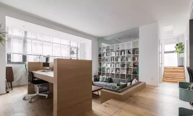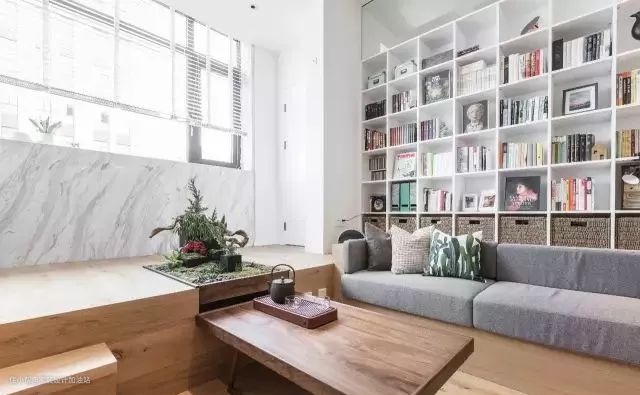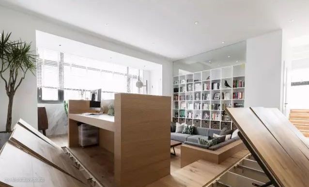 沙发背后的书架作为客厅和储藏间的分隔也便于屋主拿取书籍。(地台与书桌和沙发的衔接需要非常资深的木工现场制作)
