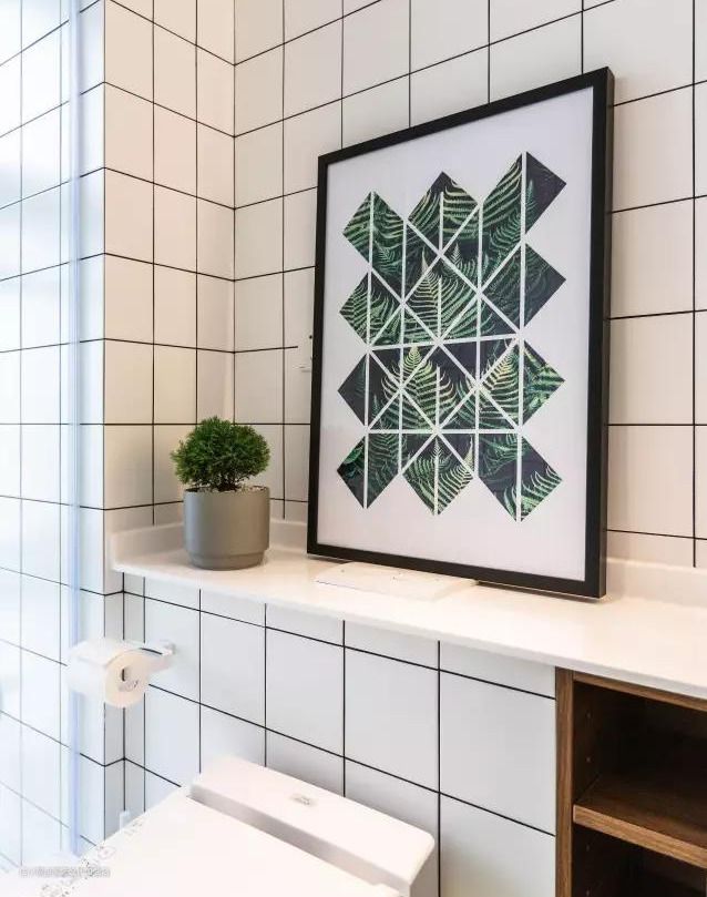 装饰画搭配喜阴绿植直接放在台面上,让卫生间多一些生气。