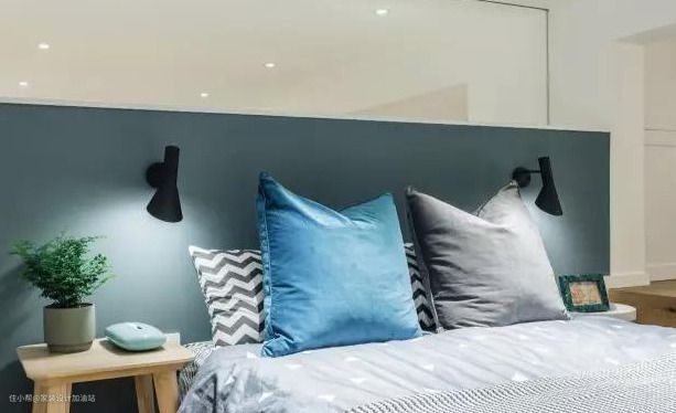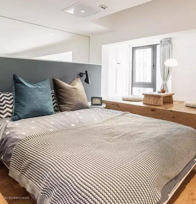 无靠背床矮床上方通透的玻璃隔墙,增加了采光度同时和客厅也有了共享空间。