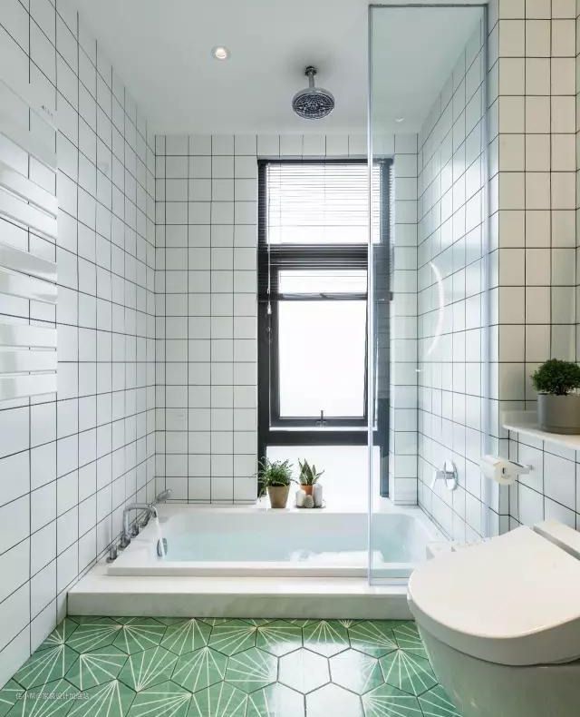 抬高的地面刚好可以实现下沉式浴缸。马桶傍边的小格子可以高低调节放置一些纸巾或者书籍,入墙式马桶和龙头,更方便清扫,成品背光化妆镜相比多一个镜前灯造型更简洁。