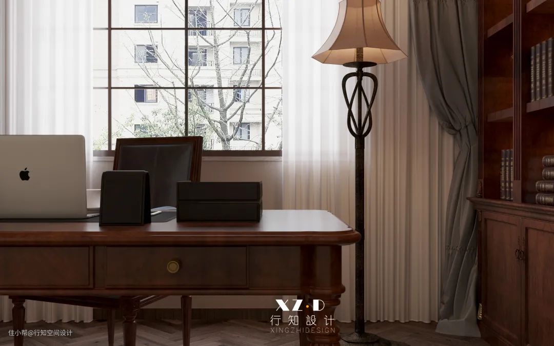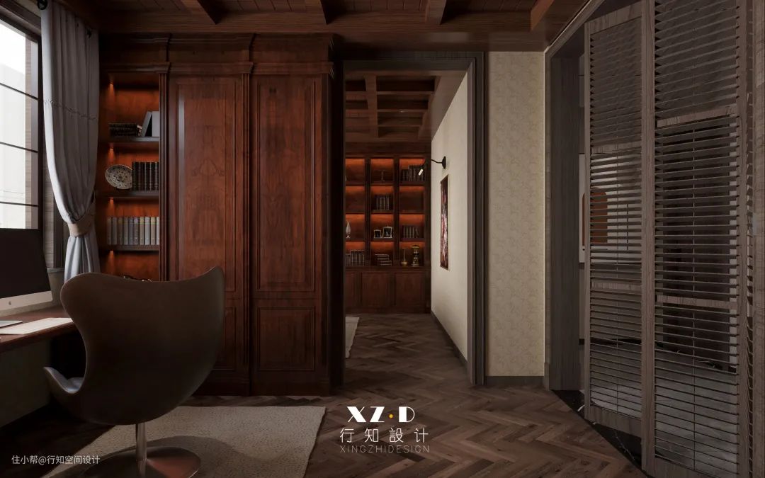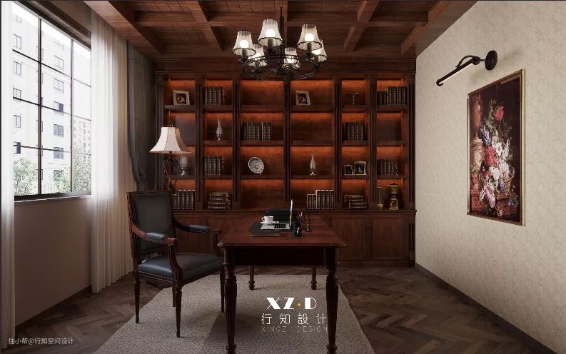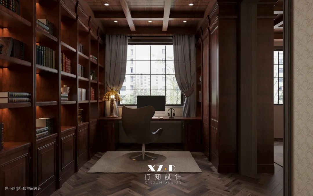 书房设计得比较复古,地面铺贴的鱼骨拼木地板,书桌背面定制一整排的开放式书架,放置书籍以及装饰品十分方便,后期拿取也比较方便。顶面的井字格造型,更能体现出书房的儒雅与端庄。