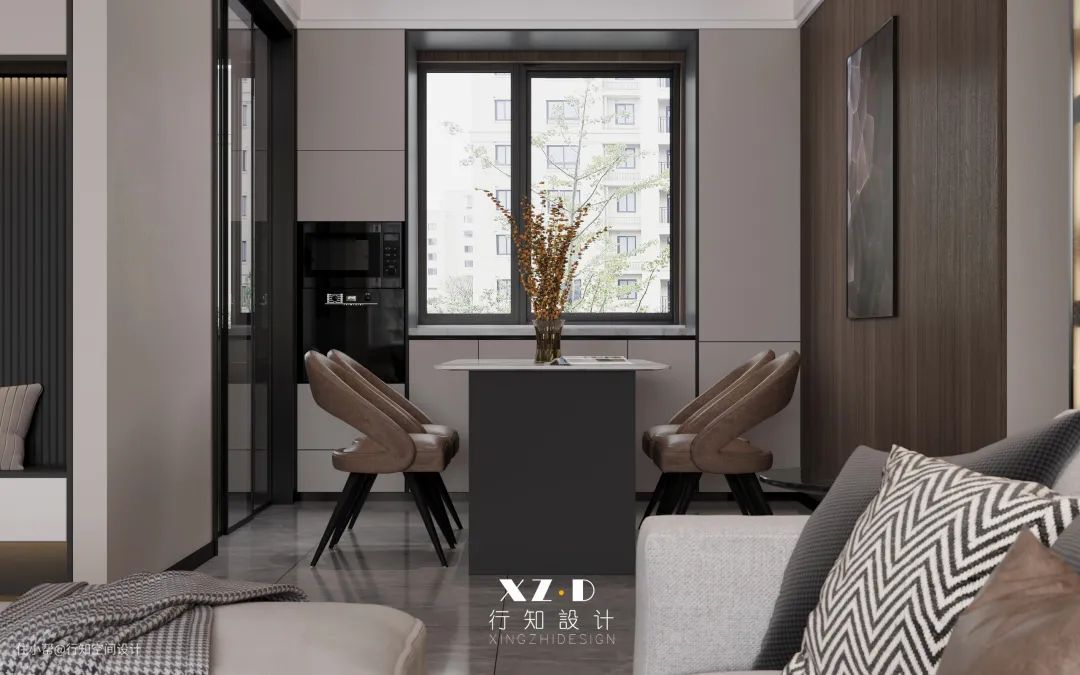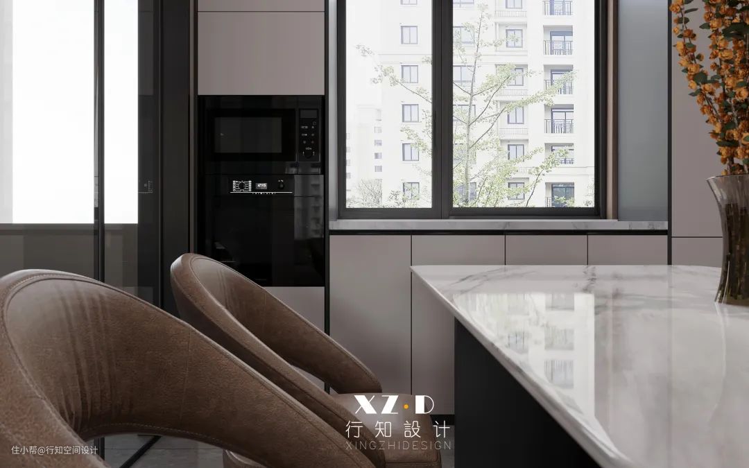 餐厅的东面墙考虑了护墙板做背景,深沉的装饰画挂在墙上,不仅美观而且也不显单调,舍弃传统餐桌,用中岛台的设计,大理石台面,台面上放置一束装束,不显单调,皮革材质的餐椅与客厅单人沙发椅相呼应,靠近窗户的那面墙合理利用起来,定制高柜和矮柜做餐厅的收纳,烤箱嵌入到高柜内,不仅彰显统一,而且也比较节省空间。