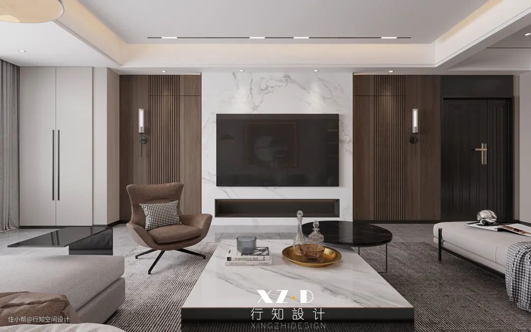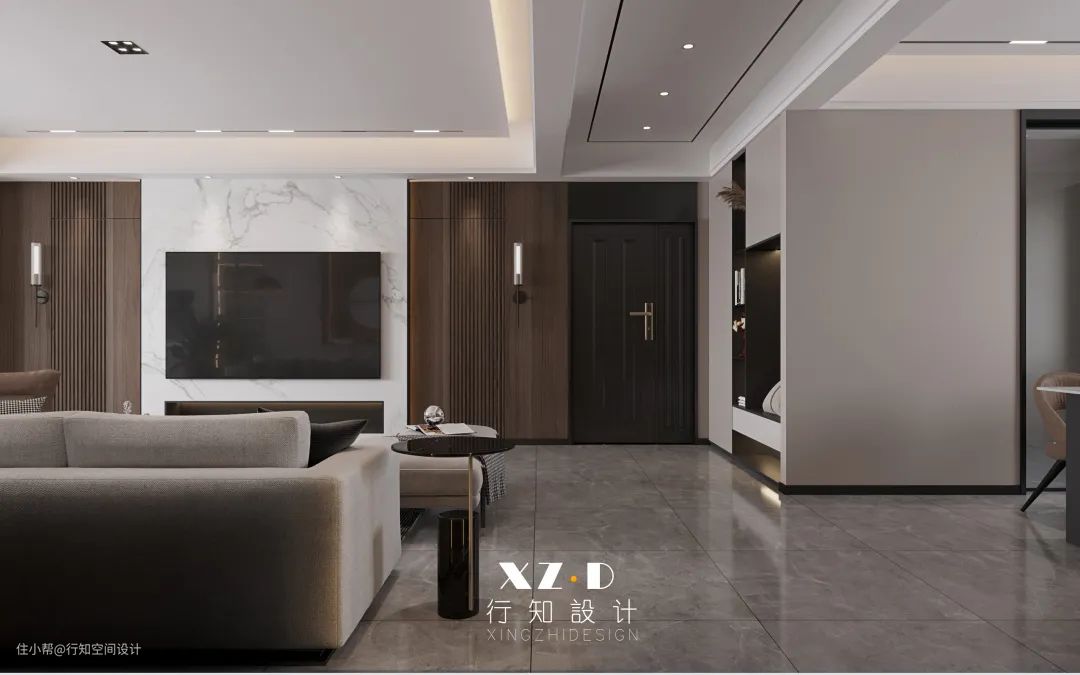 南次卧门位于电视背景墙上,设计师巧妙地利用隐形门的设计,电视挂墙,护墙板+岩板上墙,不仅美观大气同时与沙发背景墙起到对称呼应的作用。