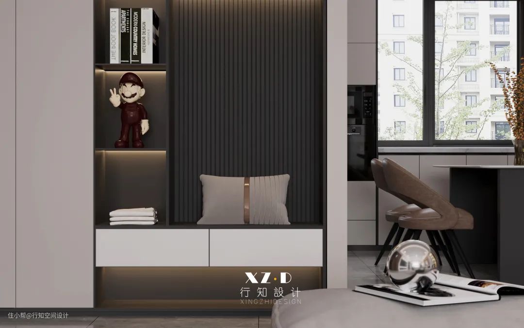 入户门的左手边是一个独立的凹位区域,设计师合理利用凹位空间定制玄关鞋柜,具备挂衣区、换鞋区、换鞋凳等多种功能组合起来,满足全家人进出门更换鞋子的条件。