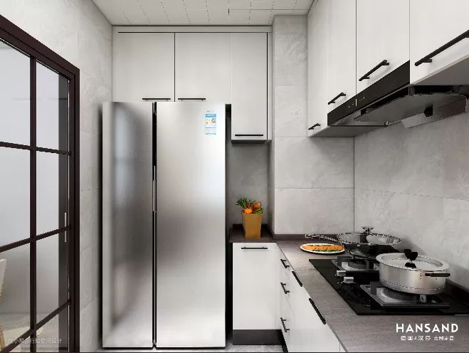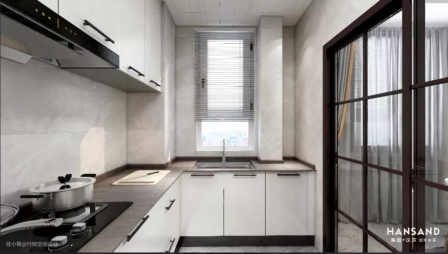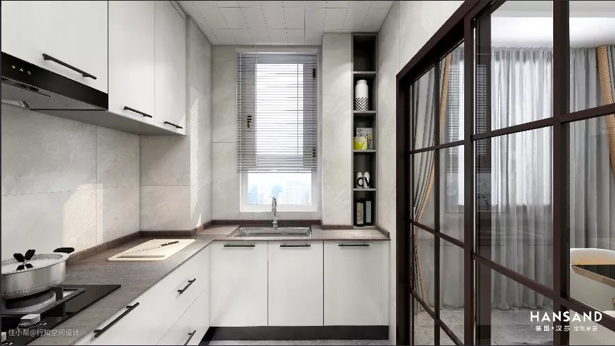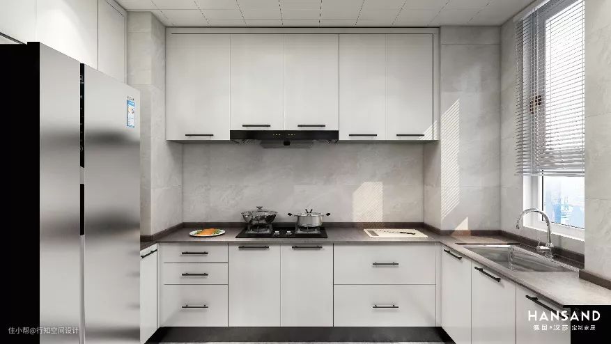 厨房空间是典型的扁长方形,但是考虑到厨房的收纳功能,设计师布置成U型,对开门冰箱放置在厨房内,拿取物品也比较方便,百叶帘安装在厨房的窗户上,不仅让厨房光线明亮,同时也比较时尚和美观。