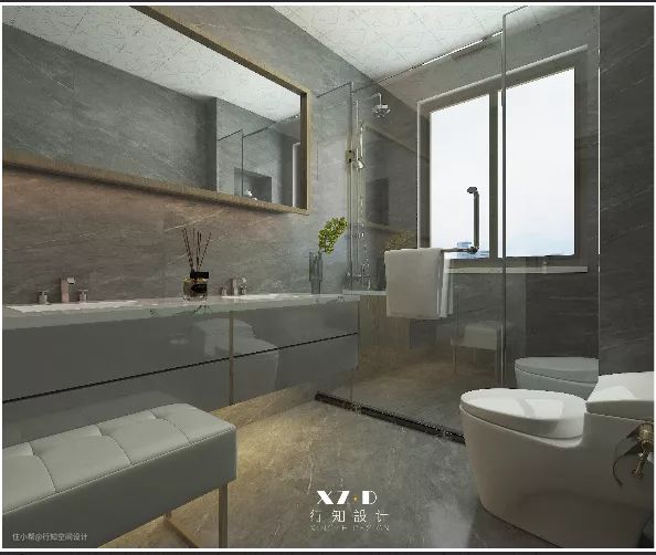 卫生间考虑了多种功能的利用,梳妆台与浴室柜组合设计,满足女主人梳妆打理条件,不仅方便,同时还能合理利用空间,玻璃隔断做干湿分离的设计,不仅延长马桶、浴室柜的使用寿命,同时还能实现干区与湿区的区域划分。