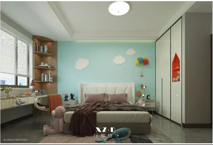 儿童房床头背景墙考虑了极光板的设计,青蓝色让空间更加丰富多彩。
