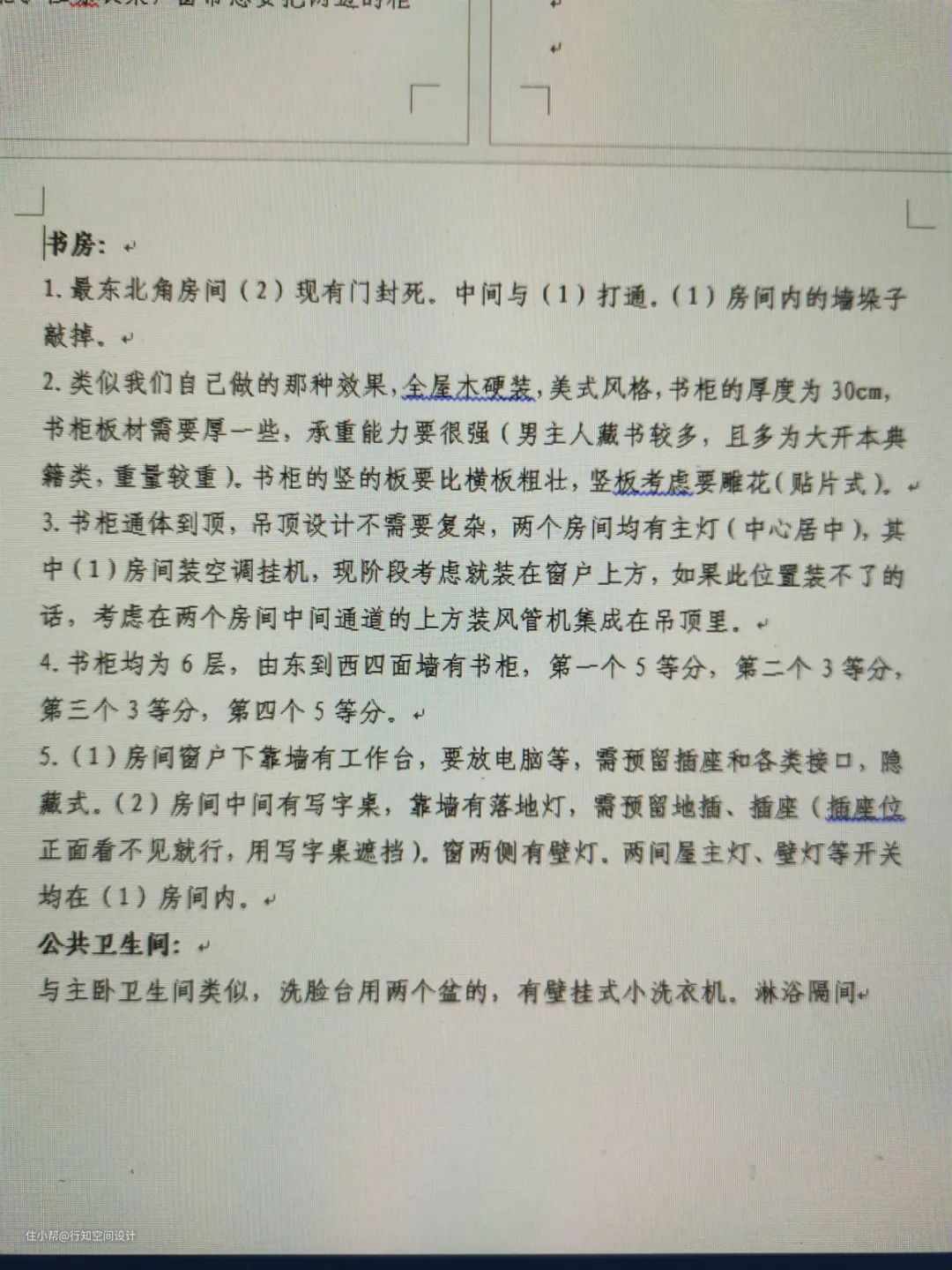 从平面图上分析出,该户型是5居室,其中四开间朝阳,三个卧室位于向阳的地方,北面两个房间计划合并成一个书房,平常看书比较多,所以为了不影响室内的收纳空间,借用墙体定制成一整排的书柜。