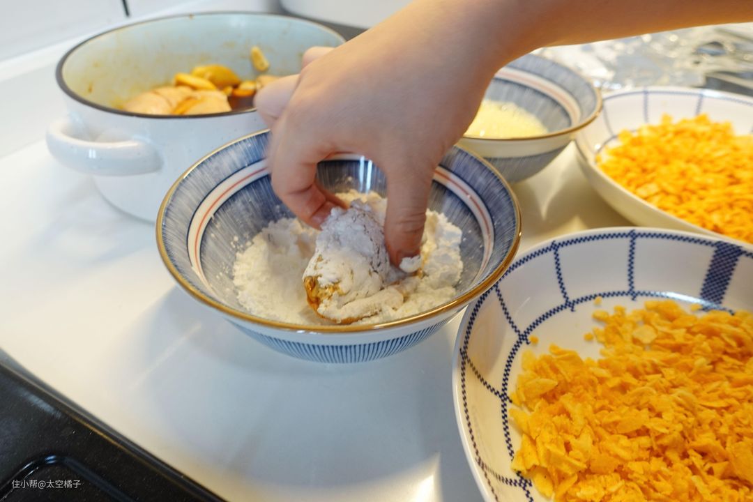 将腌制好的鸡翅均匀裹上面粉后,再蘸满蛋液。