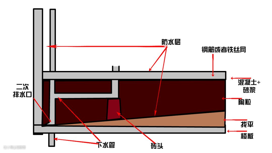 补充一点,无论是回填还是架空,下沉式卫生间在处理沉箱时,二次排水都非常重要。所谓的二次排水,就是除了我们平时卫生间的排水地漏外,在沉箱最低处还有一个隐藏的排水口。