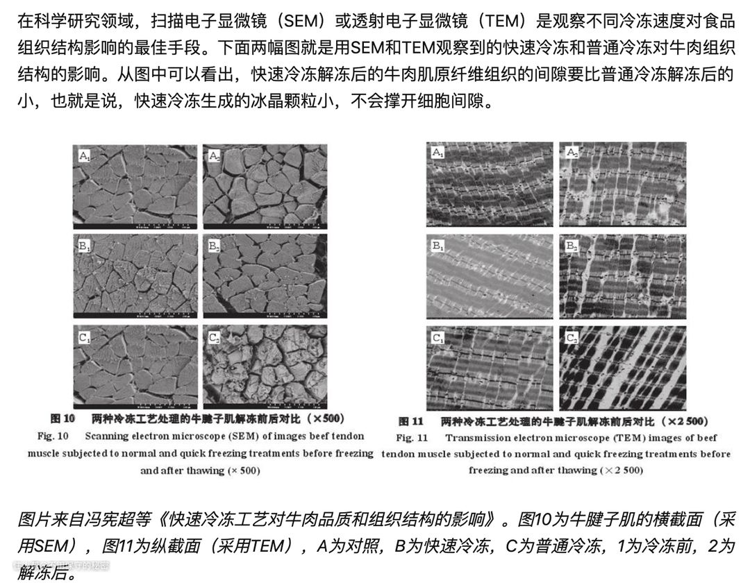 为了更直观地讲解快速冷冻的原理与好处,咱以冻肉为例子来讲讲。肌肉组织是由肌细胞组成的,水分子在细胞中不断的通过,以此来保持动态平衡,而当我们对肉类进行冷却的时候,如果冷冻速度较慢,那么冰晶就会现在细胞外形成,在细胞外溶液的浓度不断变大之后,水会不断的从细胞内转移到细胞外,再加上冰晶越来越大,不断挤压,很可能刺破细胞膜,导致汁液和水分流失。而如果冷冻速度很快,细胞内外的水分同时结冻,形成的就是较小的冰晶颗粒,不会对细胞进行损伤,也不会影响食物的口感。在这个问题上,知乎食品科学领域的大神@黄微 做出了非常详细的回答,有兴趣的朋友可以去看一下。
