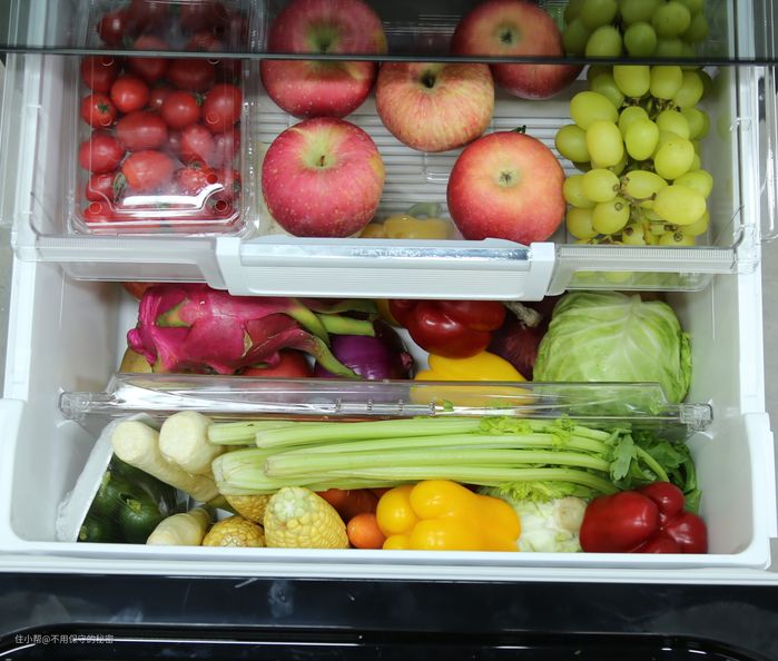 整个蔬果室被隔板分为三层,第一层我一般用来存放体积较小的水果和蔬菜,比如苹果、葡萄、圣女果之类,拿取非常方便;第二层稍高一点,既可以放点绿叶菜,也可以放点大瓶饮料,我自己在里面放的是火龙果、包菜、洋葱等稍大的食物;第三层最大,可以存放芹菜、玉米、花菜等大个蔬菜,基本上所有空间都能得到充分的利用。