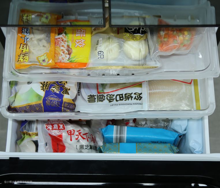 Hitachi/日立R-XG420KC冰箱拥有一大一小两个不同的冷冻存储区,小冷冻室刚刚已经介绍过,这里略过不再反复解说哈。而大冷冻室内部3层结构,容量可观,放置一些牛羊肉之类的大件食材是真的方便。