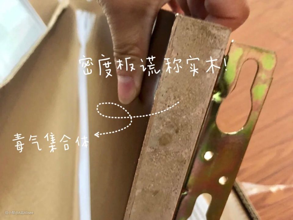 那我们买实木床的时候,最重要的就是要区分是真的实木,还是密度板贴皮冒牌的假实木。实木多层板是相对而言最好的“假实木了”,但市面上廉价的家具更甚的是用密度板、木工板、刨花板去冒充,这些都是用胶水粘合在一起的,有胶水的材质必定是有甲醛的,至于超标与否就别问了,大多数廉价的密度板的甲醛超标只有多与更多的区别。(鉴定是否是实木的真假可以在网上搜视频,不懂的话也可以给我留言,需要的话我可以帮助鉴定)