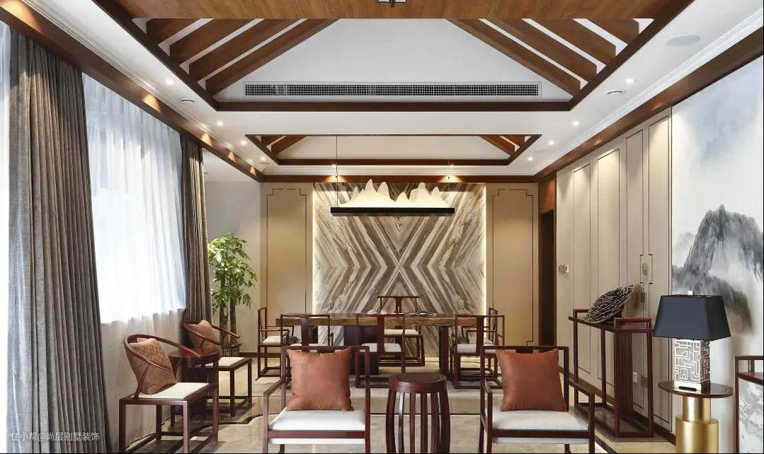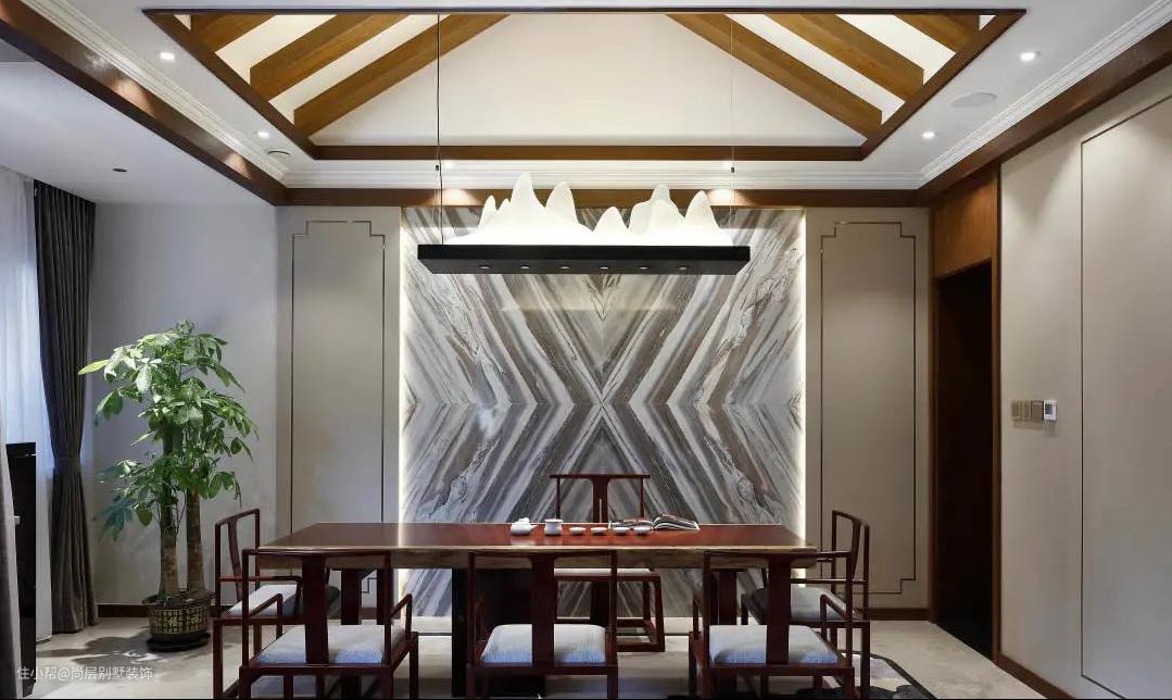 别墅装修的茶室在传统吊灯布置的基础上在吊顶内嵌点光源和在背景墙暗藏灯带,夜晚氛围更加放松,大理石背景墙上的木质纹理,增添空间灵动感。