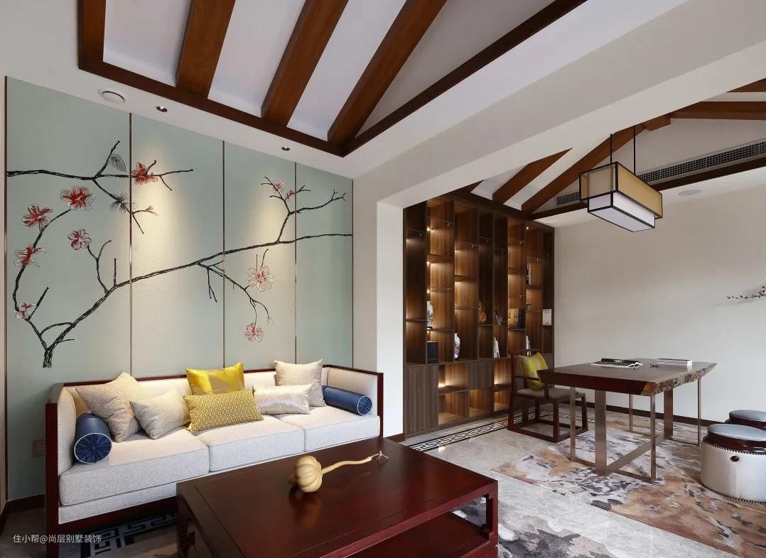 别墅装修的书房内嵌展示柜将物尽其用发挥到极致,简洁明朗的木质格栅、时尚稳重的家具以及暖色的灯光氛围,使空间兼具温润厚重与典雅贵气。