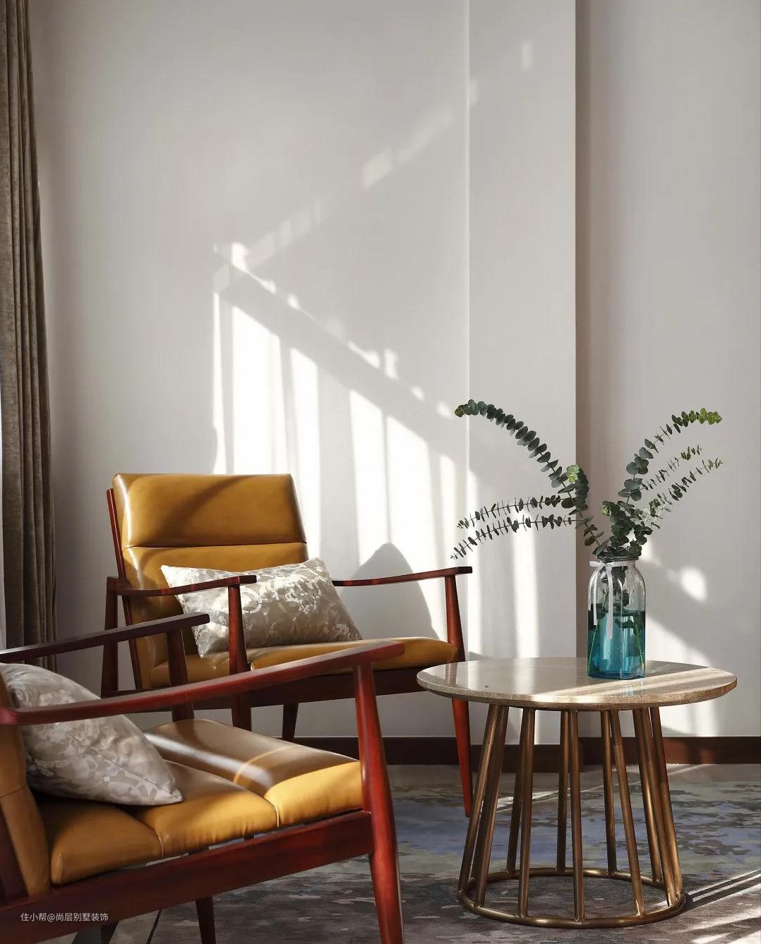 圆形的小茶几,结合金属和大理石材质的融入,让空间显得更加具有质感。阳光的融入,不仅让空间显得更加通透明亮,同时也让人更加放松,感受生活的惬意和休闲。