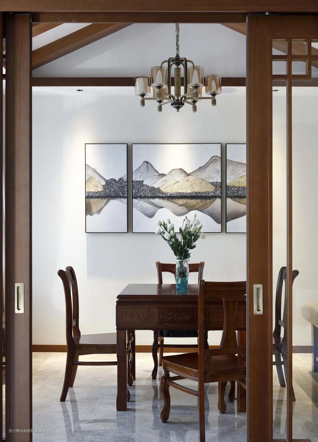 展示柜上摆放的是实木雕塑,和空间整体氛围融为一体,背景墙上的挂画,行云流水,山峦叠障,富有传统的韵味。