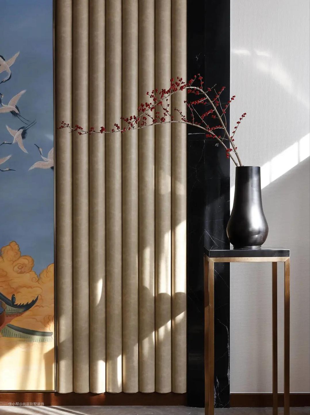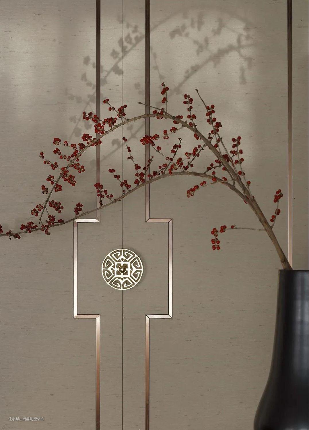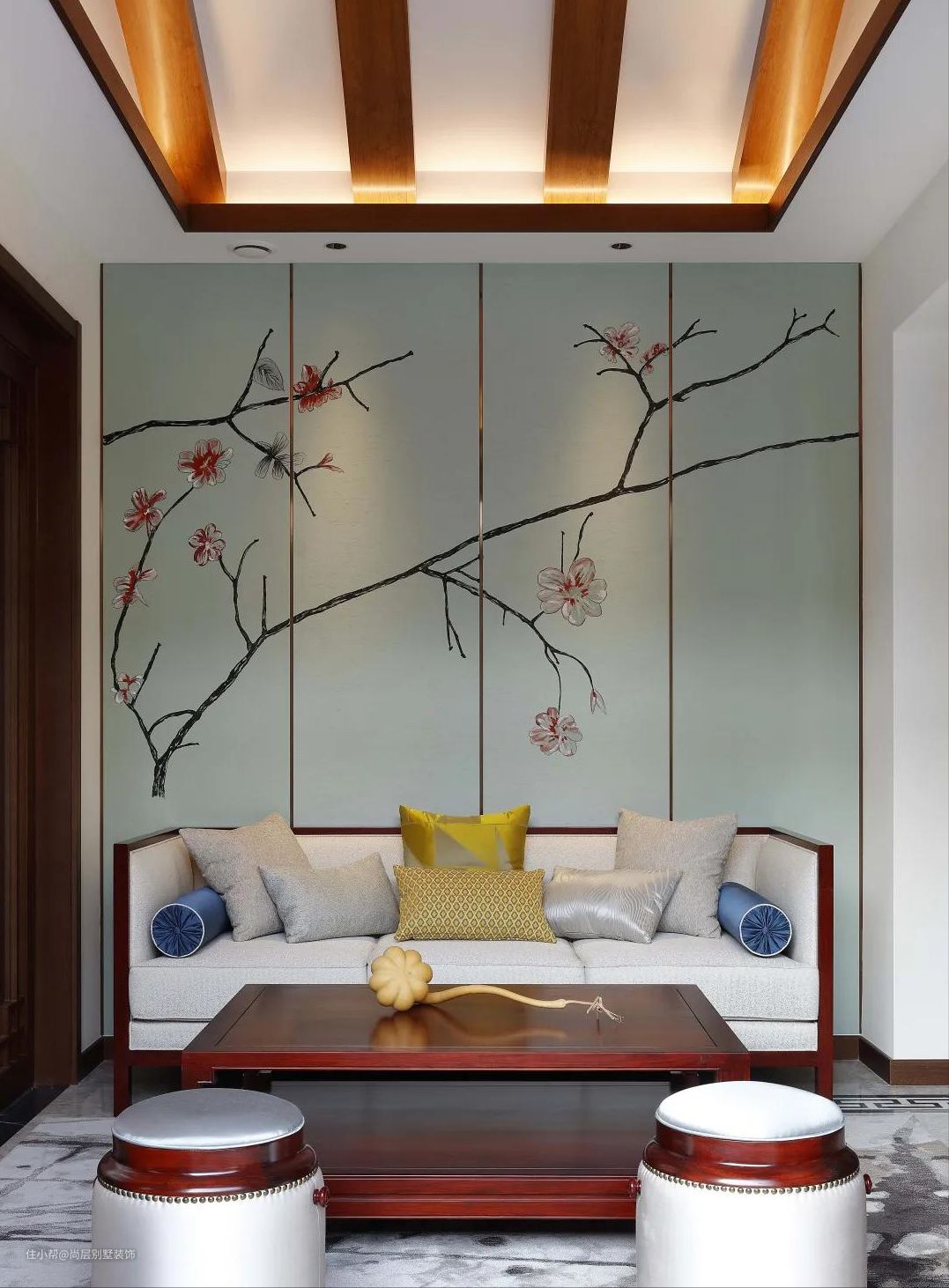 金属材质的融入,以及传统元素的点缀,结合梅花的装饰,客厅小景美得像幅画,兼具实用与美观。