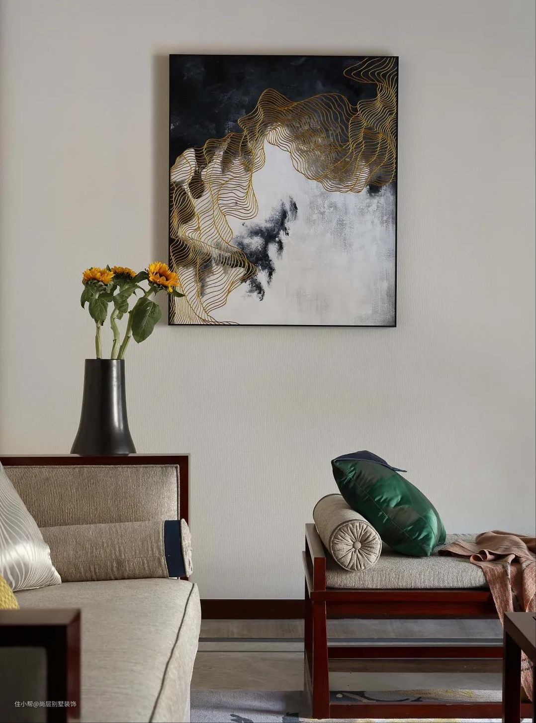 挂画,向日葵元素的花,红木家具,以及地毯的元素,交相辉映,大气融合,自然大气,宜赏宜居。