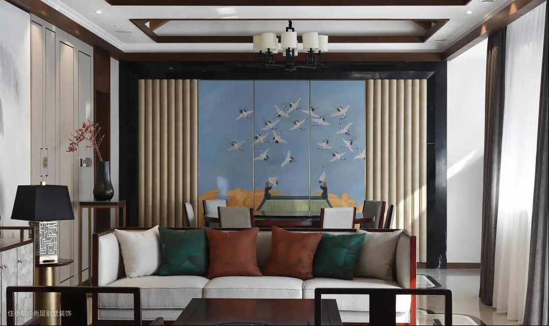客厅延续了明清时期家居配饰理念,提炼了其中经典元素,大气磅礴的山水墨画与地毯相互映衬,实木茶几与禅意十足的配饰彰显厚重感。