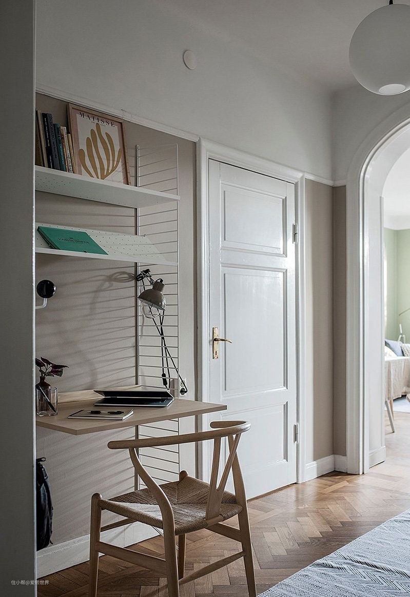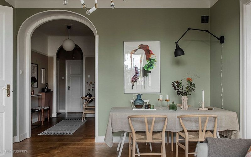 ▲ 绿墙白色门,在深原木色的地板上,摆放素色桌布装饰的餐桌,点缀质朴休闲的Y椅,壁灯是沉稳的黑色。通过拱形门过渡到色彩更暖的卧房,使整个空间具有视觉冲击力。